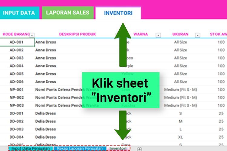 Pertama buka file Excel Online Shop Fashion.xls yang sudah kamu download. Kemudian klik sheet Inventori pada bagian tab sheet seperti gambar di bawah. Pada sheet inventori ini kamu bisa mengisikan Informasi stok produk yang akan kamu jual pada online store maupun offline store kamu.