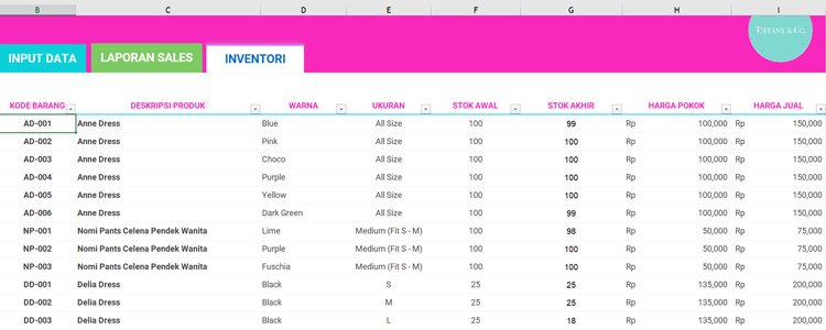 Pada tabel isian terdapat beberapa kolom sebagai detail Informasi sebuah produk, antara lain: Kode Barang, Deskripsi Produk, Warna, Ukuran, Stok Awal, Stok Akhir, Harga Pokok (atau harga pembelian produk), dan Harga Jual. Masukan kode barang terlebih dahulu, sebagai contoh AD-001 untuk produk Anne Dress berwarna blue dengan ukuran all size. Produk AD-001 ini semisal memiliki stok awal 100 piece. Pada kolom stok akhir tidak perlu kamu tuliskan yah, karena nanti akan update nilainya apabila terjadi penjualan (data pada sheet Input Data Penjualan). Selanjutnya Harga Pokok AD-001 adalah Rp 100.000 dan akan kamu jual senilai Rp 150.000, masukan nilai Rp 100.000 pada kolom Harga Pokok dan Rp 150.000 pada kolom Harga Jual. Lanjutkan hingga semua produk yang kamu miliki tercatat pada sheet Inventori. Tips untuk melanjutkan setelah memasukan angka Rp 150.000 cukup klik tombol tab pada keyboard yah, secara otomatis isian pindah ke baris bawah.