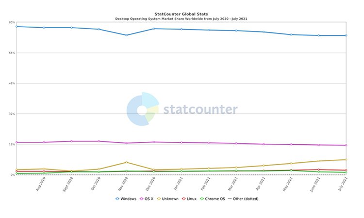 Membahas soal komputer, menurut StatCounter pada akhir Juli 2021 sistem operasi yang paling banyak digunakan di dunia adalah sistem operasi windows yang dikembangkan oleh Microsoft Corporation. Data yang tercatat ada lebih dari 72,97% pengguna komputer di dunia yang menggunakan sistem operasi Windows menyusul dibelakangnya sistem besutan Apple yaitu OS X dengan jumlah 15,4% pengguna, Linux OS sebanyak 2,38% pengguna dan Chrome OS (buatan Google) sebanyak 1,21%.