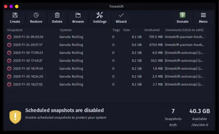 Menggunakan sistem operasi baik Windows, Mac OS dan Linux kerap kali mengalami kendala saat terjadi pembaruan sistem. Garuda Linux OS mengurangi resiko saat pembaruan rilis bergulir, bahwa pembaruan sistem tidak dapat di-boot setelah pembaruan yang bermasalah. Garuda Linux OS menyiasati penggunaan sistem file BTRFS yang terintegrasi dengan Timeshift yang menggunakan fitur snapshot otomatis, yaitu mencadangkan akses konfigurasi sistem sebelumnya setiap terjadinya pembaruan hingga 5 langkah sebelumnya.